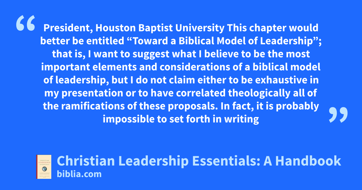 President, Houston Baptist University This chapter would better be entitled “Toward a Biblical Model of Leadership”; that is, I want to suggest what I believe to be the most important elements and considerations of a biblical model of leadership, but I do not claim either to be exhaustive in my presentation or to have correlated theologically all of the ramifications of these proposals. In fact, it is probably impossible to set forth in writing