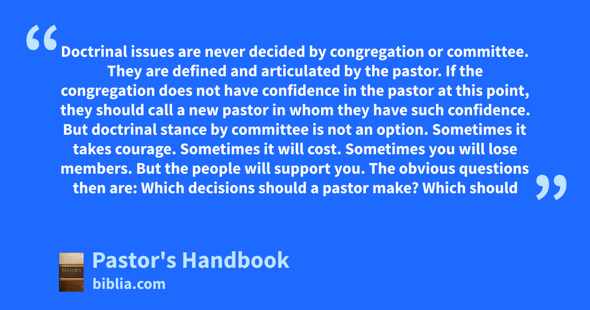 Doctrinal issues are never decided by congregation or committee. They are defined and articulated by the pastor. If the congregation does not have confidence in the pastor at this point, they should call a new pastor in whom they have such confidence. But doctrinal stance by committee is not an option. Sometimes it takes courage. Sometimes it will cost. Sometimes you will lose members. But the people will support you. The obvious questions then are: Which decisions should a pastor make? Which should