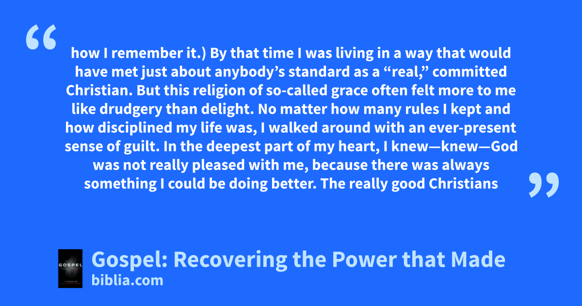 how I remember it.) By that time I was living in a way that would have met just about anybody’s standard as a “real,” committed Christian. But this religion of so-called grace often felt more to me like drudgery than delight. No matter how many rules I kept and how disciplined my life was, I walked around with an ever-present sense of guilt. In the deepest part of my heart, I knew—knew—God was not really pleased with me, because there was always something I could be doing better. The really good Christians