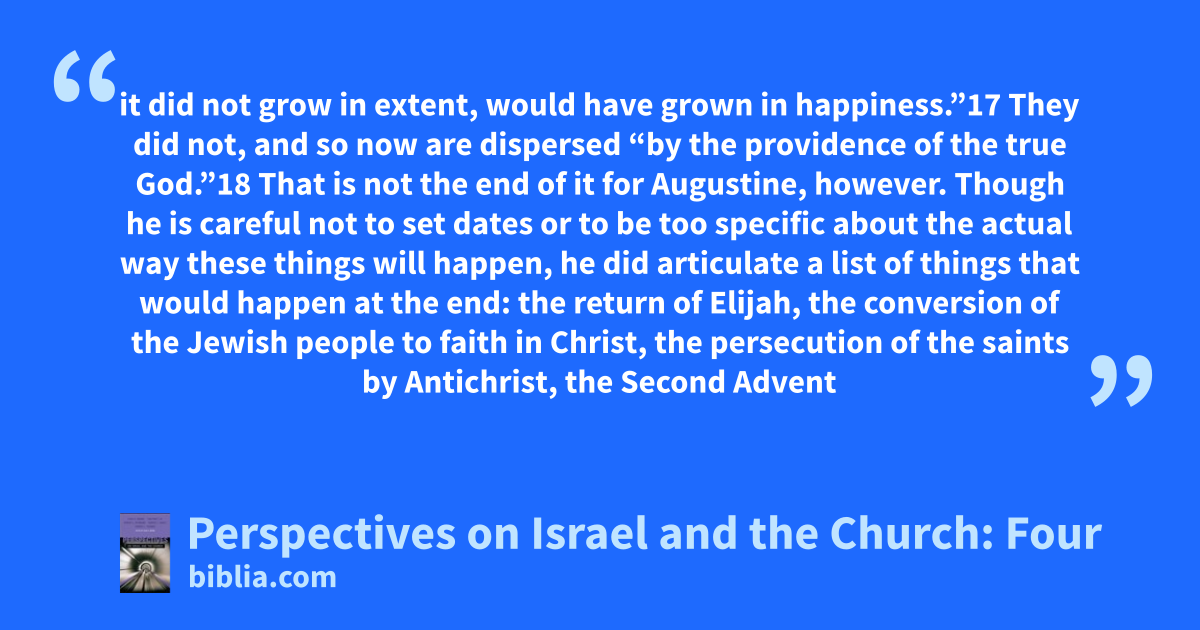 it did not grow in extent, would have grown in happiness.”17 They did not, and so now are dispersed “by the providence of the true God.”18 That is not the end of it for Augustine, however. Though he is careful not to set dates or to be too specific about the actual way these things will happen, he did articulate a list of things that would happen at the end: the return of Elijah, the conversion of the Jewish people to faith in Christ, the persecution of the saints by Antichrist, the Second Advent