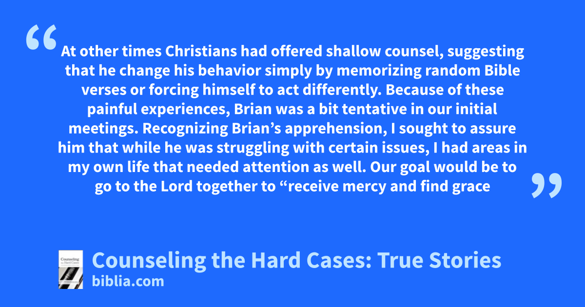 At other times Christians had offered shallow counsel, suggesting that he change his behavior simply by memorizing random Bible verses or forcing himself to act differently. Because of these painful experiences, Brian was a bit tentative in our initial meetings. Recognizing Brian’s apprehension, I sought to assure him that while he was struggling with certain issues, I had areas in my own life that needed attention as well. Our goal would be to go to the Lord together to “receive mercy and find grace
