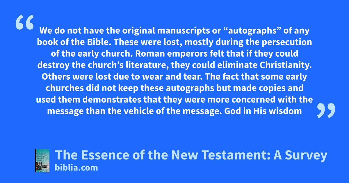 We do not have the original manuscripts or “autographs” of any book of the Bible. These were lost, mostly during the persecution of the early church. Roman emperors felt that if they could destroy the church’s literature, they could eliminate Christianity. Others were lost due to wear and tear. The fact that some early churches did not keep these autographs but made copies and used them demonstrates that they were more concerned with the message than the vehicle of the message. God in His wisdom