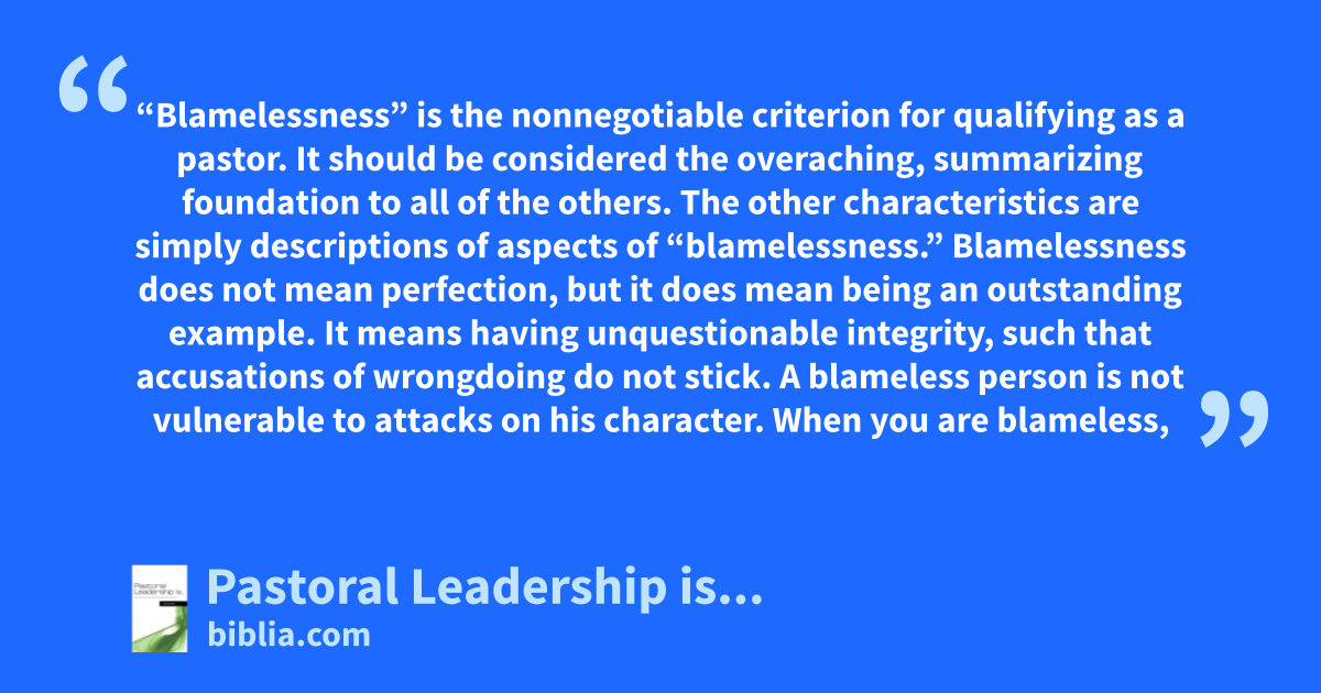 “Blamelessness” is the nonnegotiable criterion for qualifying as a pastor. It should be considered the overaching, summarizing foundation to all of the others. The other characteristics are simply descriptions of aspects of “blamelessness.” Blamelessness does not mean perfection, but it does mean being an outstanding example. It means having unquestionable integrity, such that accusations of wrongdoing do not stick. A blameless person is not vulnerable to attacks on his character. When you are blameless,