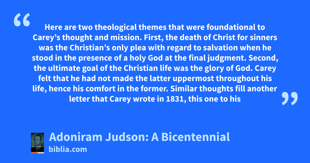Here are two theological themes that were foundational to Carey’s thought and mission. First, the death of Christ for sinners was the Christian’s only plea with regard to salvation when he stood in the presence of a holy God at the final judgment. Second, the ultimate goal of the Christian life was the glory of God. Carey felt that he had not made the latter uppermost throughout his life, hence his comfort in the former. Similar thoughts fill another letter that Carey wrote in 1831, this one to his