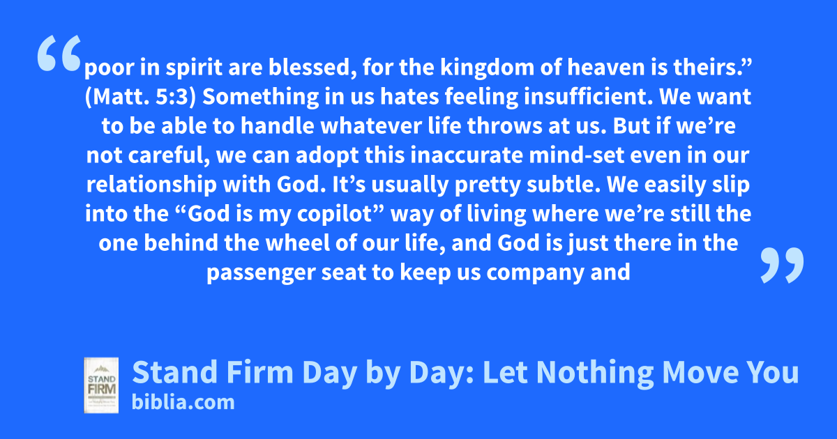 poor in spirit are blessed, for the kingdom of heaven is theirs.” (Matt. 5:3) Something in us hates feeling insufficient. We want to be able to handle whatever life throws at us. But if we’re not careful, we can adopt this inaccurate mind-set even in our relationship with God. It’s usually pretty subtle. We easily slip into the “God is my copilot” way of living where we’re still the one behind the wheel of our life, and God is just there in the passenger seat to keep us company and