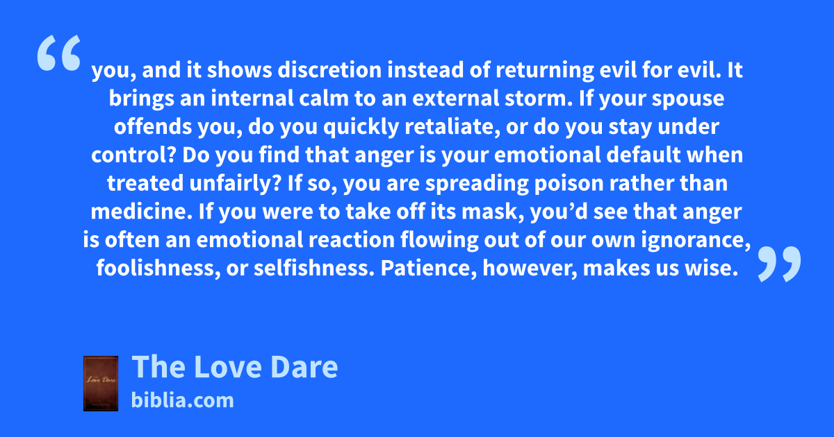 you, and it shows discretion instead of returning evil for evil. It brings an internal calm to an external storm. If your spouse offends you, do you quickly retaliate, or do you stay under control? Do you find that anger is your emotional default when treated unfairly? If so, you are spreading poison rather than medicine. If you were to take off its mask, you’d see that anger is often an emotional reaction flowing out of our own ignorance, foolishness, or selfishness. Patience, however, makes us wise.