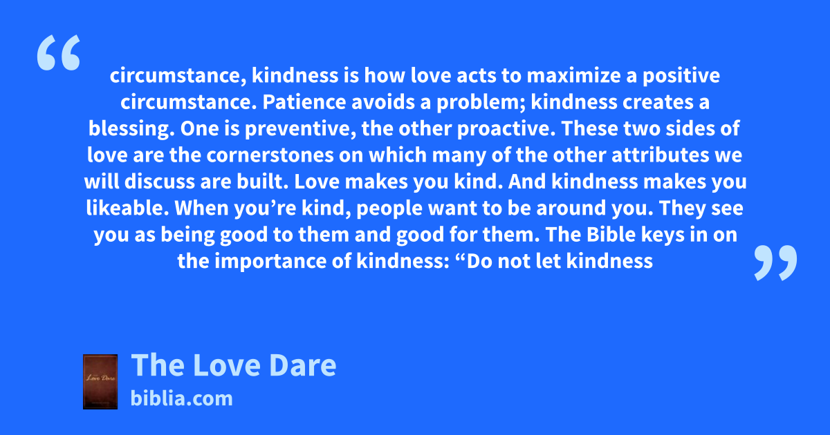 circumstance, kindness is how love acts to maximize a positive circumstance. Patience avoids a problem; kindness creates a blessing. One is preventive, the other proactive. These two sides of love are the cornerstones on which many of the other attributes we will discuss are built. Love makes you kind. And kindness makes you likeable. When you’re kind, people want to be around you. They see you as being good to them and good for them. The Bible keys in on the importance of kindness: “Do not let kindness