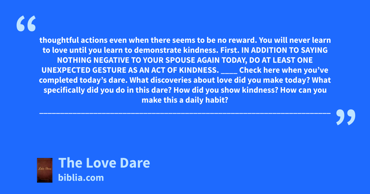 Unconditional love is eagerly promised at weddings, but rarely practiced in real life. As a result, romantic hopes are often replaced with disappointment in the home. But it doesn’t have to stay that way. The Love Dare, the New York Times No. 1 best seller that has sold five million copies and was major plot device in the popular movie Fireproof, is a 40-day challenge for husbands and wives to...