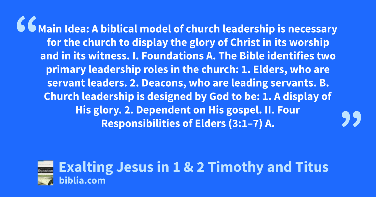 Main Idea: A biblical model of church leadership is necessary for the church to display the glory of Christ in its worship and in its witness. I. Foundations A. The Bible identifies two primary leadership roles in the church: 1. Elders, who are servant leaders. 2. Deacons, who are leading servants. B. Church leadership is designed by God to be: 1. A display of His glory. 2. Dependent on His gospel. II. Four Responsibilities of Elders (3:1–7) A.