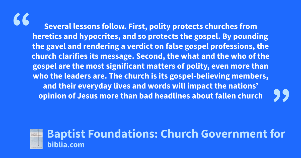 Several lessons follow. First, polity protects churches from heretics and hypocrites, and so protects the gospel. By pounding the gavel and rendering a verdict on false gospel professions, the church clarifies its message. Second, the what and the who of the gospel are the most significant matters of polity, even more than who the leaders are. The church is its gospel-believing members, and their everyday lives and words will impact the nations’ opinion of Jesus more than bad headlines about fallen church