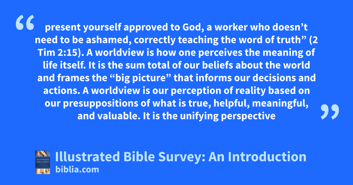 present yourself approved to God, a worker who doesn’t need to be ashamed, correctly teaching the word of truth” (2 Tim 2:15). A worldview is how one perceives the meaning of life itself. It is the sum total of our beliefs about the world and frames the “big picture” that informs our decisions and actions. A worldview is our perception of reality based on our presuppositions of what is true, helpful, meaningful, and valuable. It is the unifying perspective