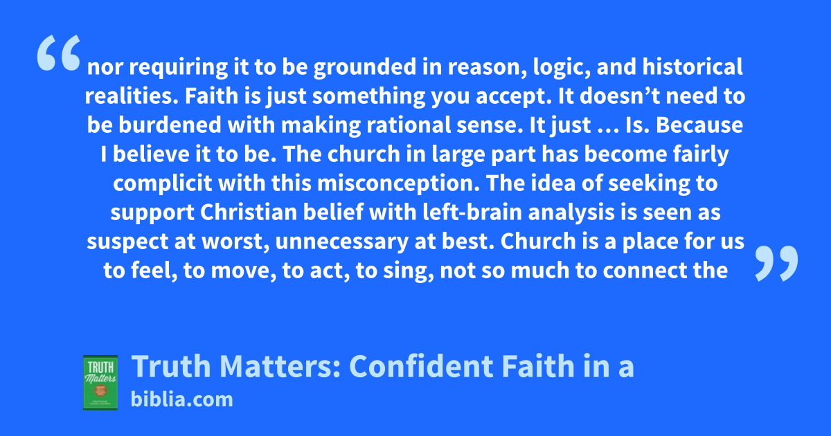 nor requiring it to be grounded in reason, logic, and historical realities. Faith is just something you accept. It doesn’t need to be burdened with making rational sense. It just … Is. Because I believe it to be. The church in large part has become fairly complicit with this misconception. The idea of seeking to support Christian belief with left-brain analysis is seen as suspect at worst, unnecessary at best. Church is a place for us to feel, to move, to act, to sing, not so much to connect the