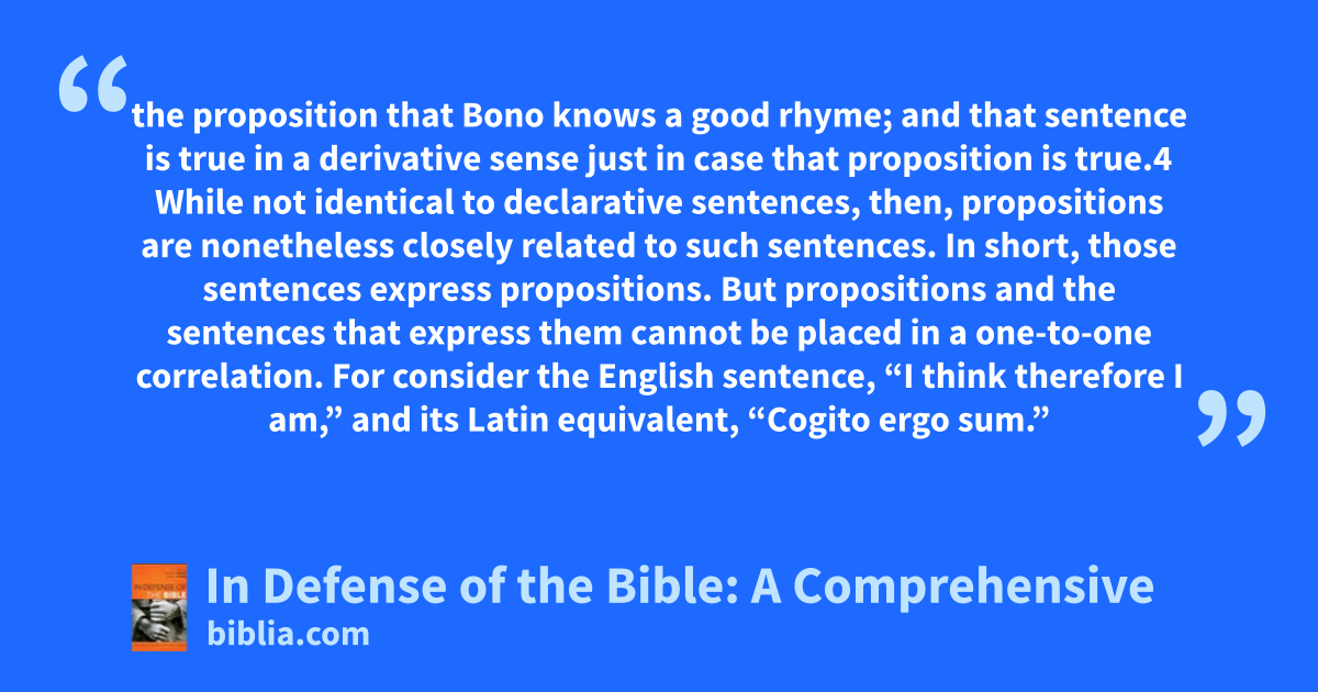 the proposition that Bono knows a good rhyme; and that sentence is true in a derivative sense just in case that proposition is true.4 While not identical to declarative sentences, then, propositions are nonetheless closely related to such sentences. In short, those sentences express propositions. But propositions and the sentences that express them cannot be placed in a one-to-one correlation. For consider the English sentence, “I think therefore I am,” and its Latin equivalent, “Cogito ergo sum.”
