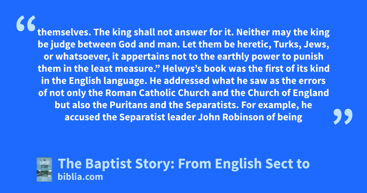 themselves. The king shall not answer for it. Neither may the king be judge between God and man. Let them be heretic, Turks, Jews, or whatsoever, it appertains not to the earthly power to punish them in the least measure.” Helwys’s book was the first of its kind in the English language. He addressed what he saw as the errors of not only the Roman Catholic Church and the Church of England but also the Puritans and the Separatists. For example, he accused the Separatist leader John Robinson of being