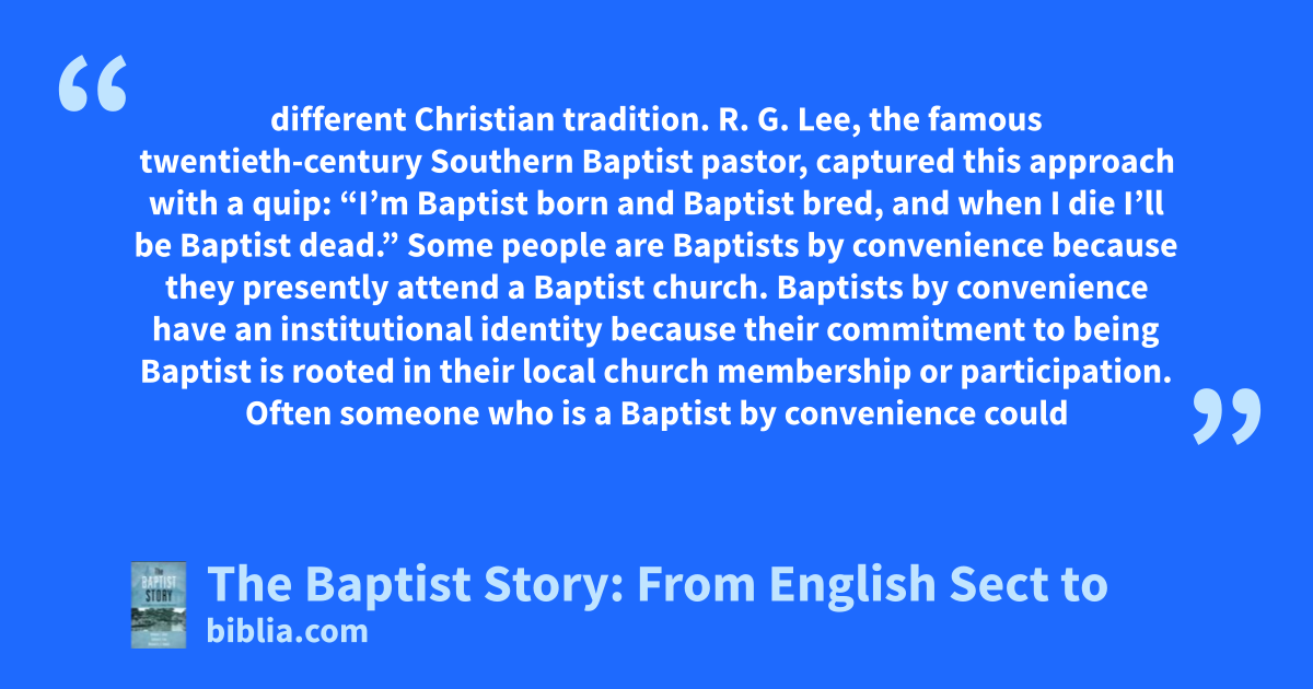 different Christian tradition. R. G. Lee, the famous twentieth-century Southern Baptist pastor, captured this approach with a quip: “I’m Baptist born and Baptist bred, and when I die I’ll be Baptist dead.” Some people are Baptists by convenience because they presently attend a Baptist church. Baptists by convenience have an institutional identity because their commitment to being Baptist is rooted in their local church membership or participation. Often someone who is a Baptist by convenience could