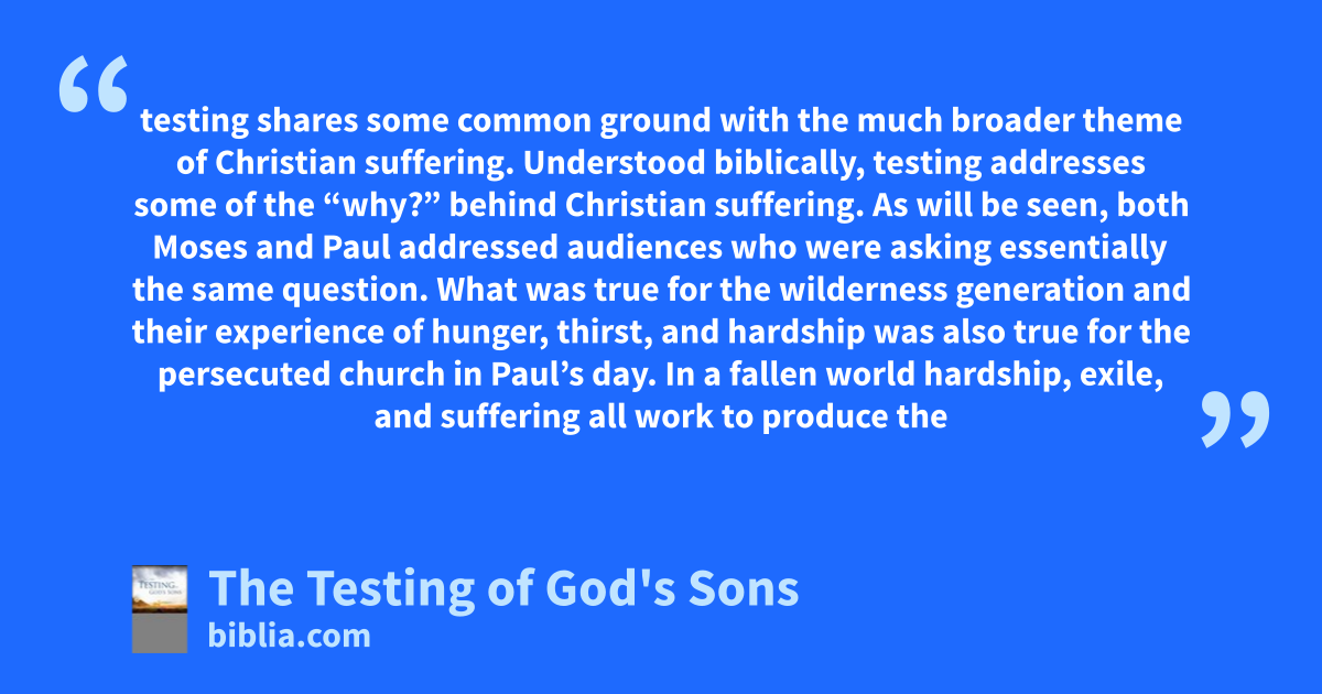 testing shares some common ground with the much broader theme of Christian suffering. Understood biblically, testing addresses some of the “why?” behind Christian suffering. As will be seen, both Moses and Paul addressed audiences who were asking essentially the same question. What was true for the wilderness generation and their experience of hunger, thirst, and hardship was also true for the persecuted church in Paul’s day. In a fallen world hardship, exile, and suffering all work to produce the