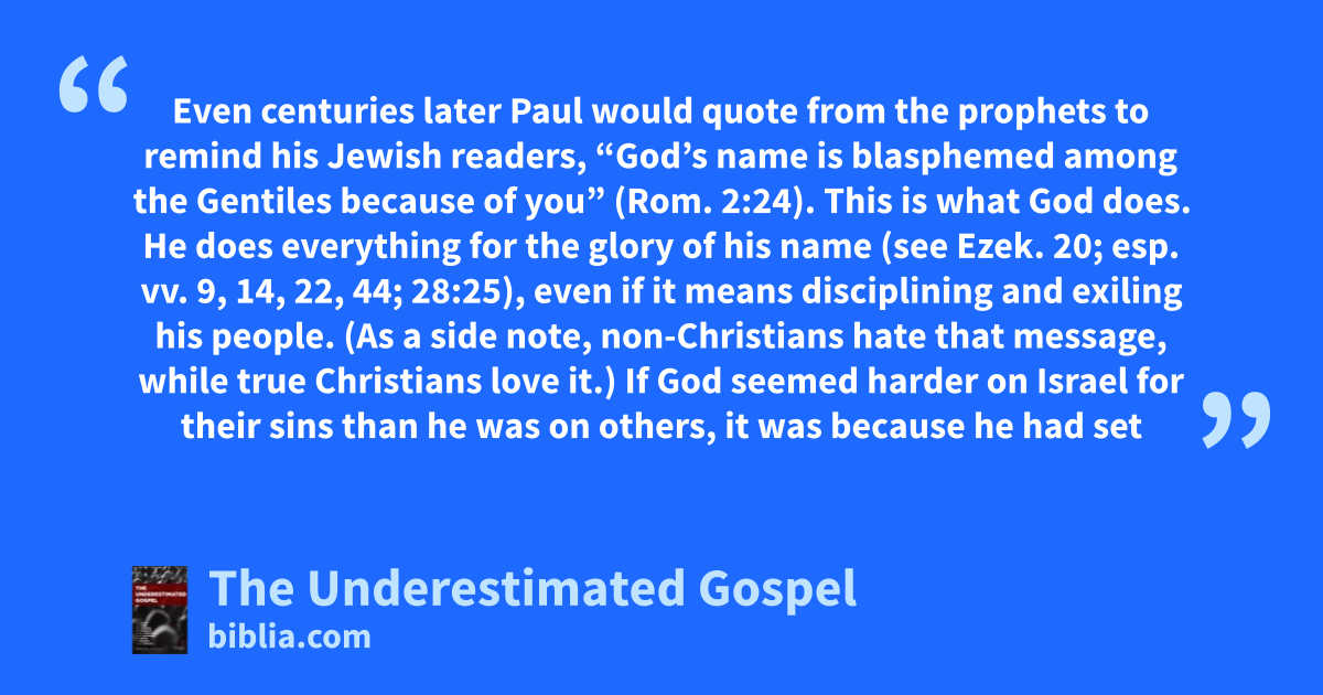 Even centuries later Paul would quote from the prophets to remind his Jewish readers, “God’s name is blasphemed among the Gentiles because of you” (Rom. 2:24). This is what God does. He does everything for the glory of his name (see Ezek. 20; esp. vv. 9, 14, 22, 44; 28:25), even if it means disciplining and exiling his people. (As a side note, non-Christians hate that message, while true Christians love it.) If God seemed harder on Israel for their sins than he was on others, it was because he had set