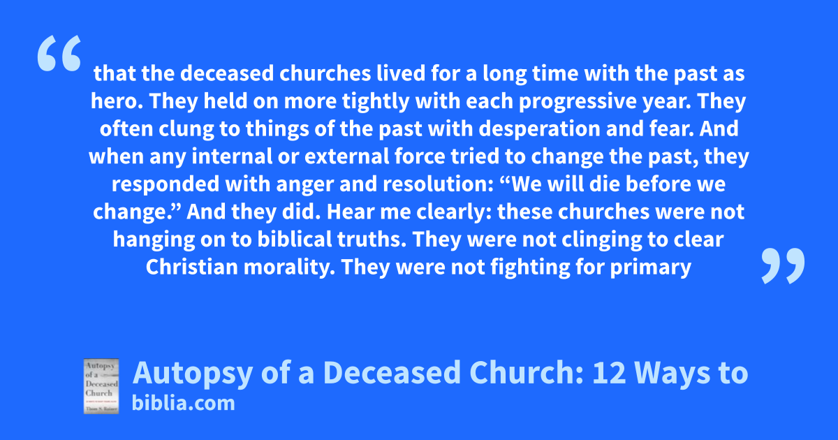 that the deceased churches lived for a long time with the past as hero. They held on more tightly with each progressive year. They often clung to things of the past with desperation and fear. And when any internal or external force tried to change the past, they responded with anger and resolution: “We will die before we change.” And they did. Hear me clearly: these churches were not hanging on to biblical truths. They were not clinging to clear Christian morality. They were not fighting for primary