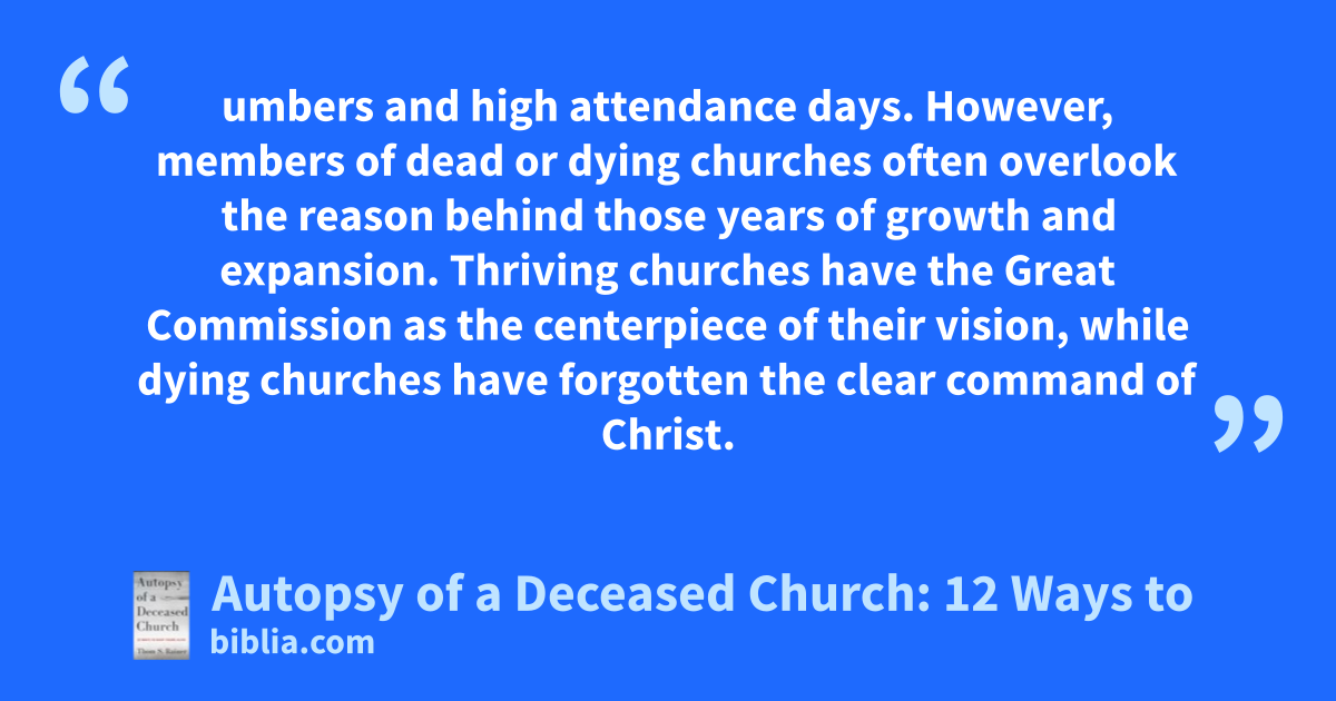 umbers and high attendance days. However, members of dead or dying churches often overlook the reason behind those years of growth and expansion. Thriving churches have the Great Commission as the centerpiece of their vision, while dying churches have forgotten the clear command of Christ.
