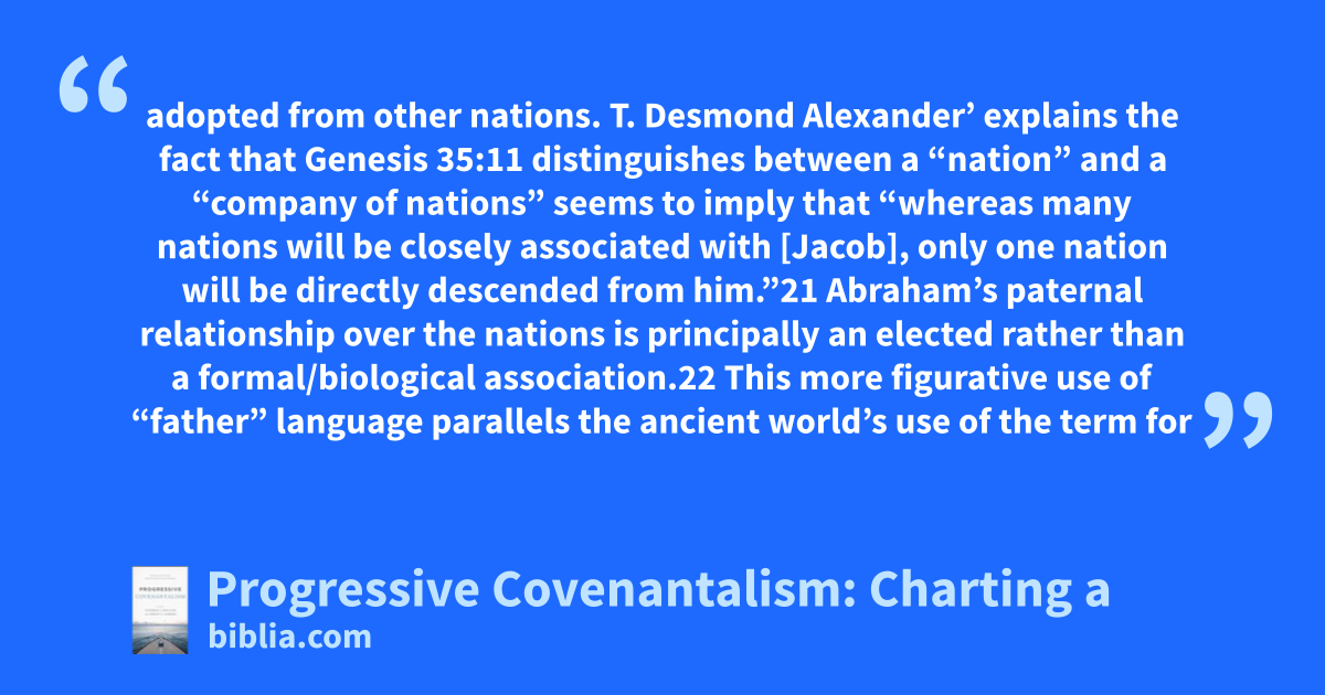 adopted from other nations. T. Desmond Alexander’ explains the fact that Genesis 35:11 distinguishes between a “nation” and a “company of nations” seems to imply that “whereas many nations will be closely associated with [Jacob], only one nation will be directly descended from him.”21 Abraham’s paternal relationship over the nations is principally an elected rather than a formal/biological association.22 This more figurative use of “father” language parallels the ancient world’s use of the term for