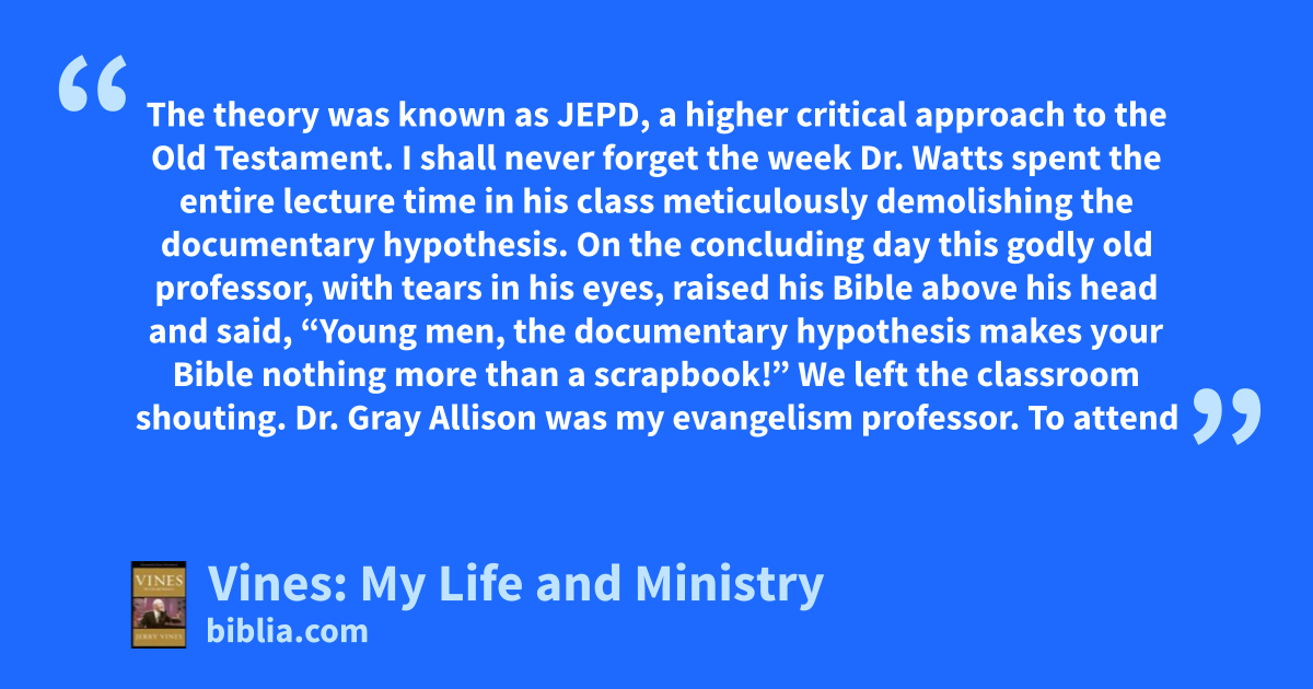 The theory was known as JEPD, a higher critical approach to the Old Testament. I shall never forget the week Dr. Watts spent the entire lecture time in his class meticulously demolishing the documentary hypothesis. On the concluding day this godly old professor, with tears in his eyes, raised his Bible above his head and said, “Young men, the documentary hypothesis makes your Bible nothing more than a scrapbook!” We left the classroom shouting. Dr. Gray Allison was my evangelism professor. To attend