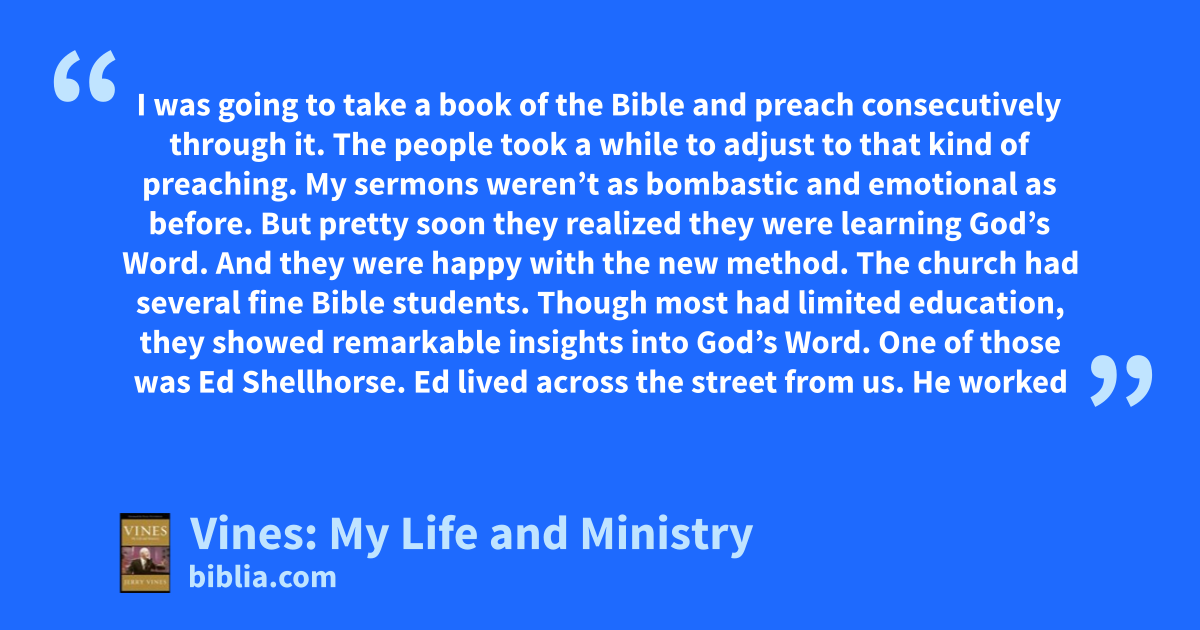 I was going to take a book of the Bible and preach consecutively through it. The people took a while to adjust to that kind of preaching. My sermons weren’t as bombastic and emotional as before. But pretty soon they realized they were learning God’s Word. And they were happy with the new method. The church had several fine Bible students. Though most had limited education, they showed remarkable insights into God’s Word. One of those was Ed Shellhorse. Ed lived across the street from us. He worked