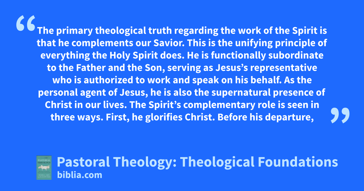 The primary theological truth regarding the work of the Spirit is that he complements our Savior. This is the unifying principle of everything the Holy Spirit does. He is functionally subordinate to the Father and the Son, serving as Jesus’s representative who is authorized to work and speak on his behalf. As the personal agent of Jesus, he is also the supernatural presence of Christ in our lives. The Spirit’s complementary role is seen in three ways. First, he glorifies Christ. Before his departure,