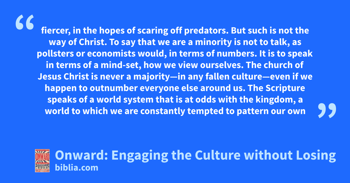 fiercer, in the hopes of scaring off predators. But such is not the way of Christ. To say that we are a minority is not to talk, as pollsters or economists would, in terms of numbers. It is to speak in terms of a mind-set, how we view ourselves. The church of Jesus Christ is never a majority—in any fallen culture—even if we happen to outnumber everyone else around us. The Scripture speaks of a world system that is at odds with the kingdom, a world to which we are constantly tempted to pattern our own