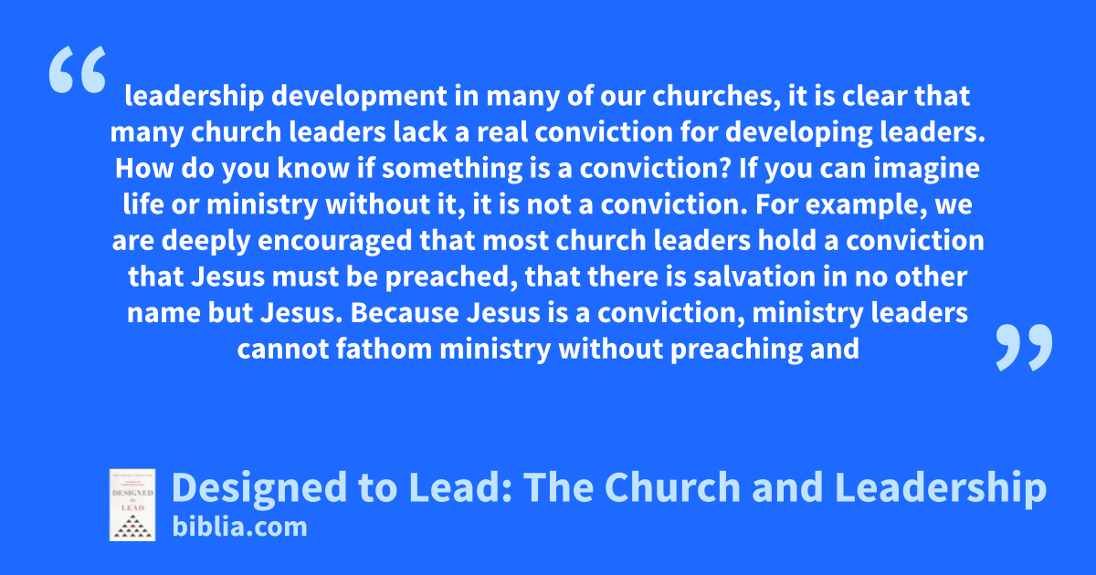 leadership development in many of our churches, it is clear that many church leaders lack a real conviction for developing leaders. How do you know if something is a conviction? If you can imagine life or ministry without it, it is not a conviction. For example, we are deeply encouraged that most church leaders hold a conviction that Jesus must be preached, that there is salvation in no other name but Jesus. Because Jesus is a conviction, ministry leaders cannot fathom ministry without preaching and