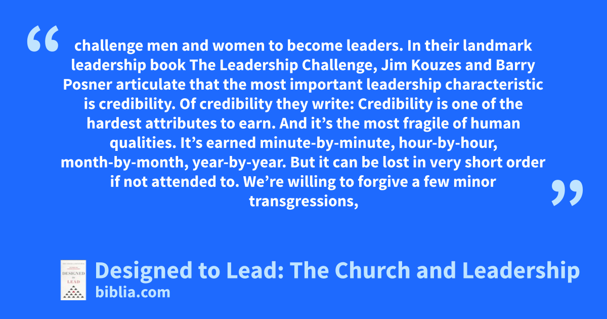 challenge men and women to become leaders. In their landmark leadership book The Leadership Challenge, Jim Kouzes and Barry Posner articulate that the most important leadership characteristic is credibility. Of credibility they write: Credibility is one of the hardest attributes to earn. And it’s the most fragile of human qualities. It’s earned minute-by-minute, hour-by-hour, month-by-month, year-by-year. But it can be lost in very short order if not attended to. We’re willing to forgive a few minor transgressions,
