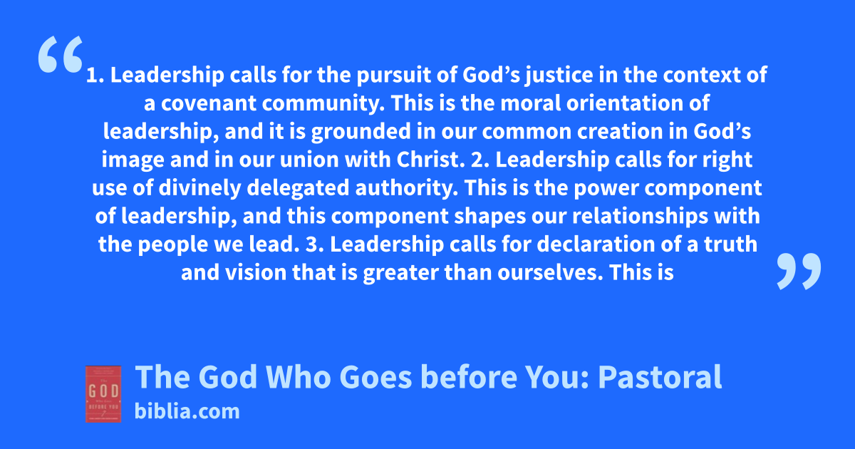 1. Leadership calls for the pursuit of God’s justice in the context of a covenant community. This is the moral orientation of leadership, and it is grounded in our common creation in God’s image and in our union with Christ. 2. Leadership calls for right use of divinely delegated authority. This is the power component of leadership, and this component shapes our relationships with the people we lead. 3. Leadership calls for declaration of a truth and vision that is greater than ourselves. This is