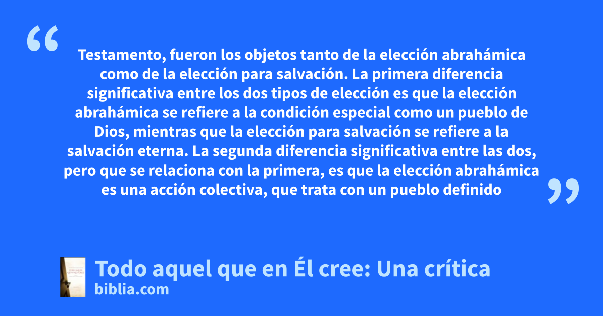 Testamento, fueron los objetos tanto de la elección abrahámica como de la elección para salvación. La primera diferencia significativa entre los dos tipos de elección es que la elección abrahámica se refiere a la condición especial como un pueblo de Dios, mientras que la elección para salvación se refiere a la salvación eterna. La segunda diferencia significativa entre las dos, pero que se relaciona con la primera, es que la elección abrahámica es una acción colectiva, que trata con un pueblo definido