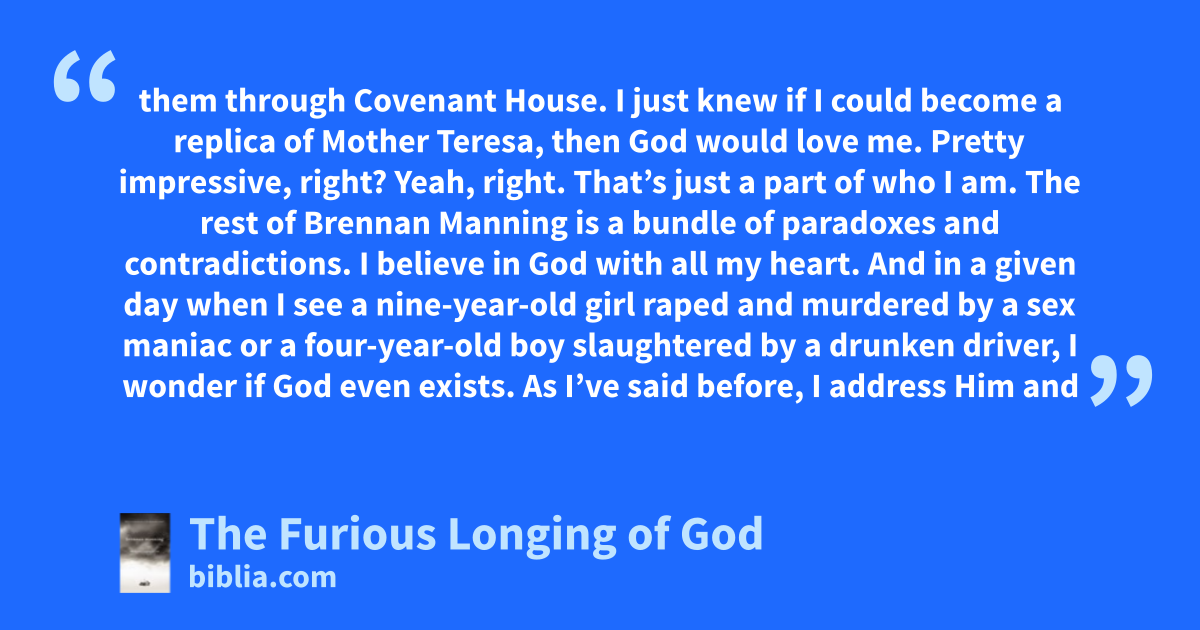 them through Covenant House. I just knew if I could become a replica of Mother Teresa, then God would love me. Pretty impressive, right? Yeah, right. That’s just a part of who I am. The rest of Brennan Manning is a bundle of paradoxes and contradictions. I believe in God with all my heart. And in a given day when I see a nine-year-old girl raped and murdered by a sex maniac or a four-year-old boy slaughtered by a drunken driver, I wonder if God even exists. As I’ve said before, I address Him and