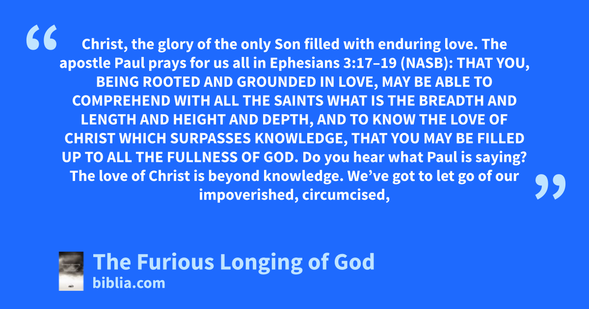 Christ, the glory of the only Son filled with enduring love. The apostle Paul prays for us all in Ephesians 3:17–19 (NASB): THAT YOU, BEING ROOTED AND GROUNDED IN LOVE, MAY BE ABLE TO COMPREHEND WITH ALL THE SAINTS WHAT IS THE BREADTH AND LENGTH AND HEIGHT AND DEPTH, AND TO KNOW THE LOVE OF CHRIST WHICH SURPASSES KNOWLEDGE, THAT YOU MAY BE FILLED UP TO ALL THE FULLNESS OF GOD. Do you hear what Paul is saying? The love of Christ is beyond knowledge. We’ve got to let go of our impoverished, circumcised,