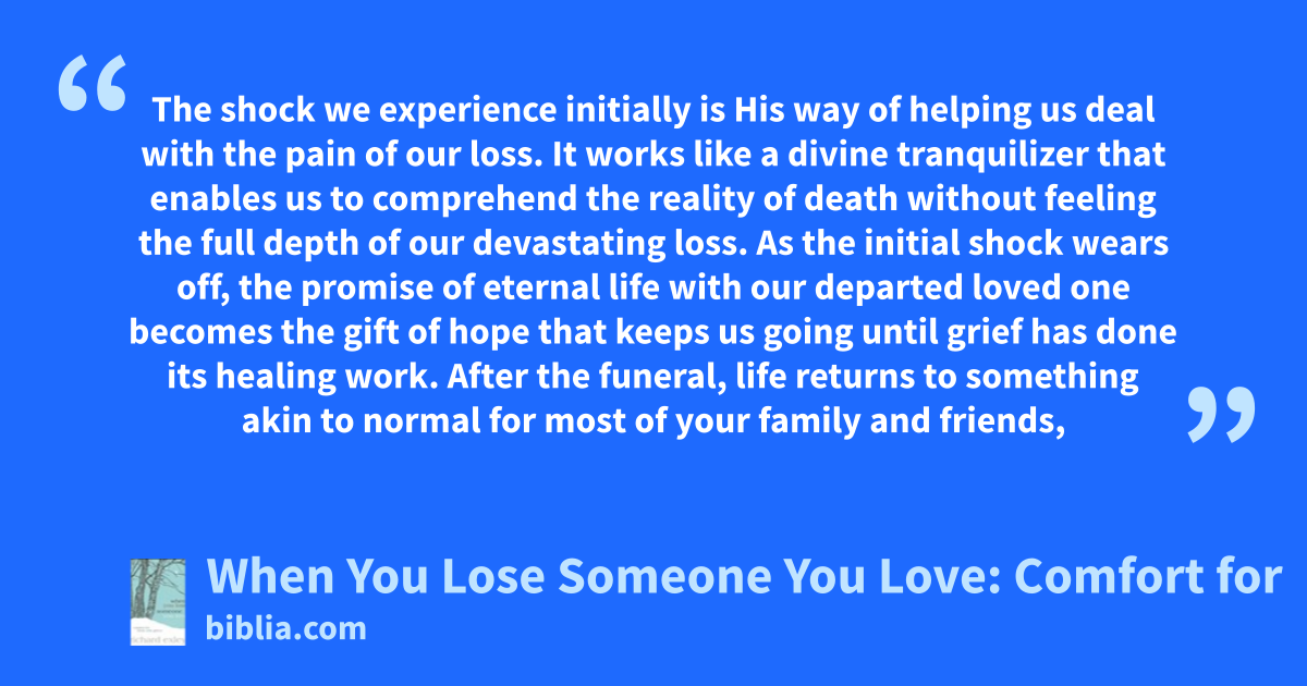 The shock we experience initially is His way of helping us deal with the pain of our loss. It works like a divine tranquilizer that enables us to comprehend the reality of death without feeling the full depth of our devastating loss. As the initial shock wears off, the promise of eternal life with our departed loved one becomes the gift of hope that keeps us going until grief has done its healing work. After the funeral, life returns to something akin to normal for most of your family and friends,