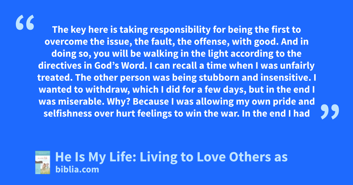 The key here is taking responsibility for being the first to overcome the issue, the fault, the offense, with good. And in doing so, you will be walking in the light according to the directives in God’s Word. I can recall a time when I was unfairly treated. The other person was being stubborn and insensitive. I wanted to withdraw, which I did for a few days, but in the end I was miserable. Why? Because I was allowing my own pride and selfishness over hurt feelings to win the war. In the end I had