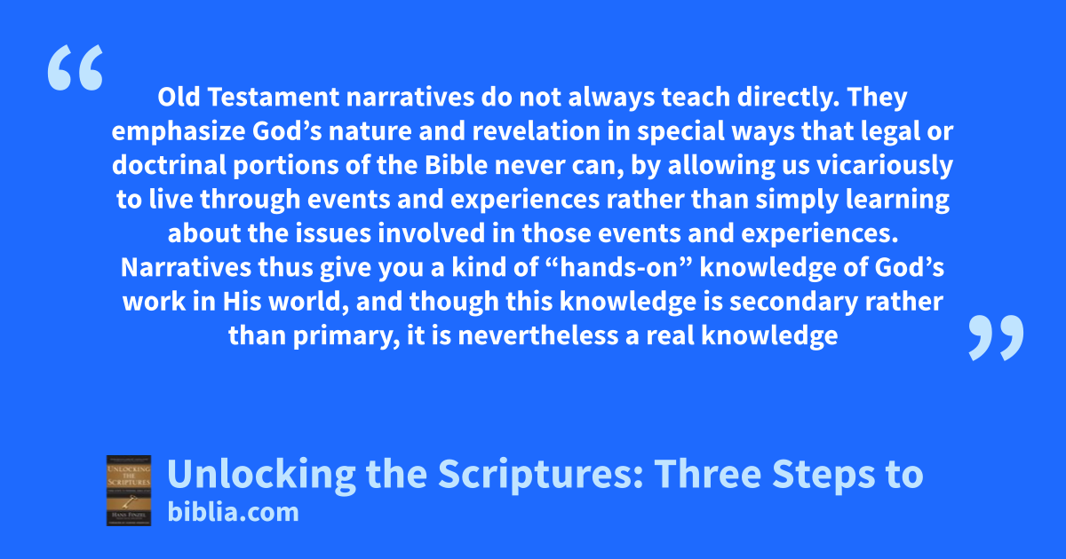 Old Testament narratives do not always teach directly. They emphasize God’s nature and revelation in special ways that legal or doctrinal portions of the Bible never can, by allowing us vicariously to live through events and experiences rather than simply learning about the issues involved in those events and experiences. Narratives thus give you a kind of “hands-on” knowledge of God’s work in His world, and though this knowledge is secondary rather than primary, it is nevertheless a real knowledge