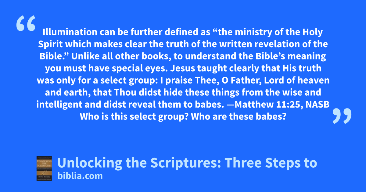 Illumination can be further defined as “the ministry of the Holy Spirit which makes clear the truth of the written revelation of the Bible.” Unlike all other books, to understand the Bible’s meaning you must have special eyes. Jesus taught clearly that His truth was only for a select group: I praise Thee, O Father, Lord of heaven and earth, that Thou didst hide these things from the wise and intelligent and didst reveal them to babes. —Matthew 11:25, NASB Who is this select group? Who are these babes?