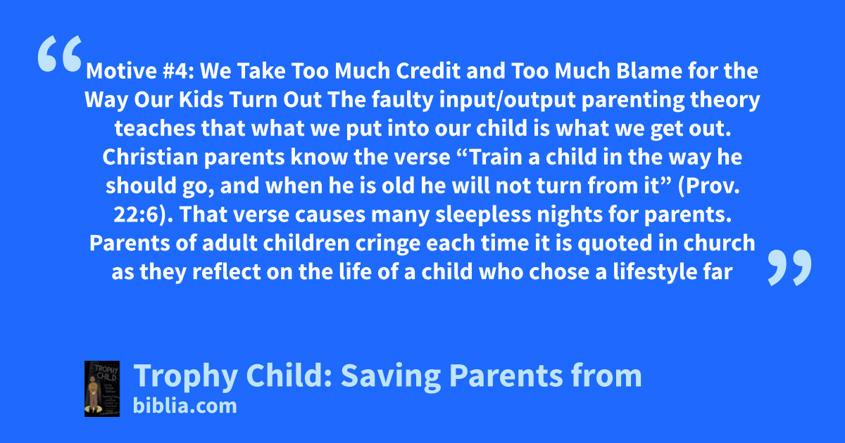 Motive #4: We Take Too Much Credit and Too Much Blame for the Way Our Kids Turn Out The faulty input/output parenting theory teaches that what we put into our child is what we get out. Christian parents know the verse “Train a child in the way he should go, and when he is old he will not turn from it” (Prov. 22:6). That verse causes many sleepless nights for parents. Parents of adult children cringe each time it is quoted in church as they reflect on the life of a child who chose a lifestyle far