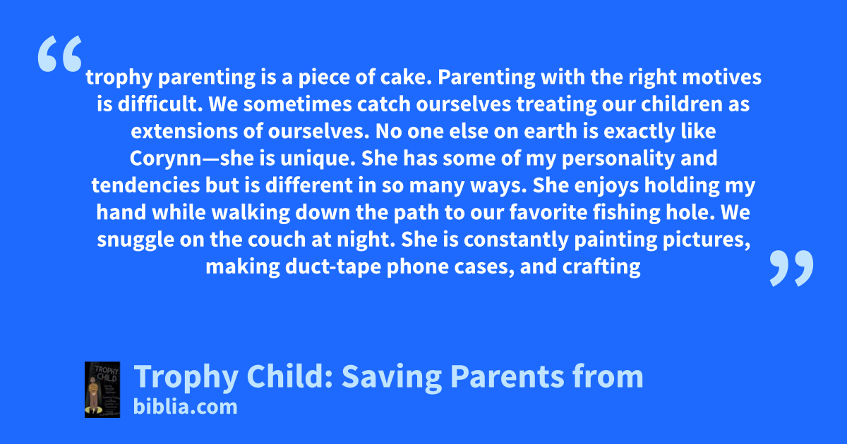 trophy parenting is a piece of cake. Parenting with the right motives is difficult. We sometimes catch ourselves treating our children as extensions of ourselves. No one else on earth is exactly like Corynn—she is unique. She has some of my personality and tendencies but is different in so many ways. She enjoys holding my hand while walking down the path to our favorite fishing hole. We snuggle on the couch at night. She is constantly painting pictures, making duct-tape phone cases, and crafting