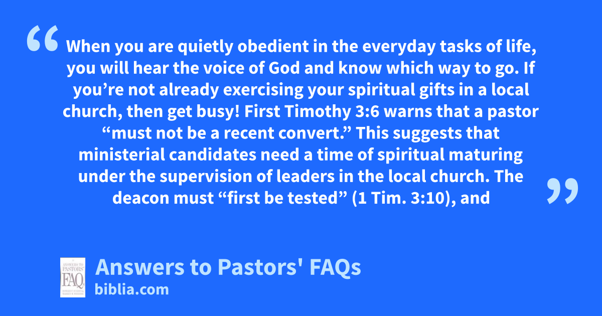 When you are quietly obedient in the everyday tasks of life, you will hear the voice of God and know which way to go. If you’re not already exercising your spiritual gifts in a local church, then get busy! First Timothy 3:6 warns that a pastor “must not be a recent convert.” This suggests that ministerial candidates need a time of spiritual maturing under the supervision of leaders in the local church. The deacon must “first be tested” (1 Tim. 3:10), and