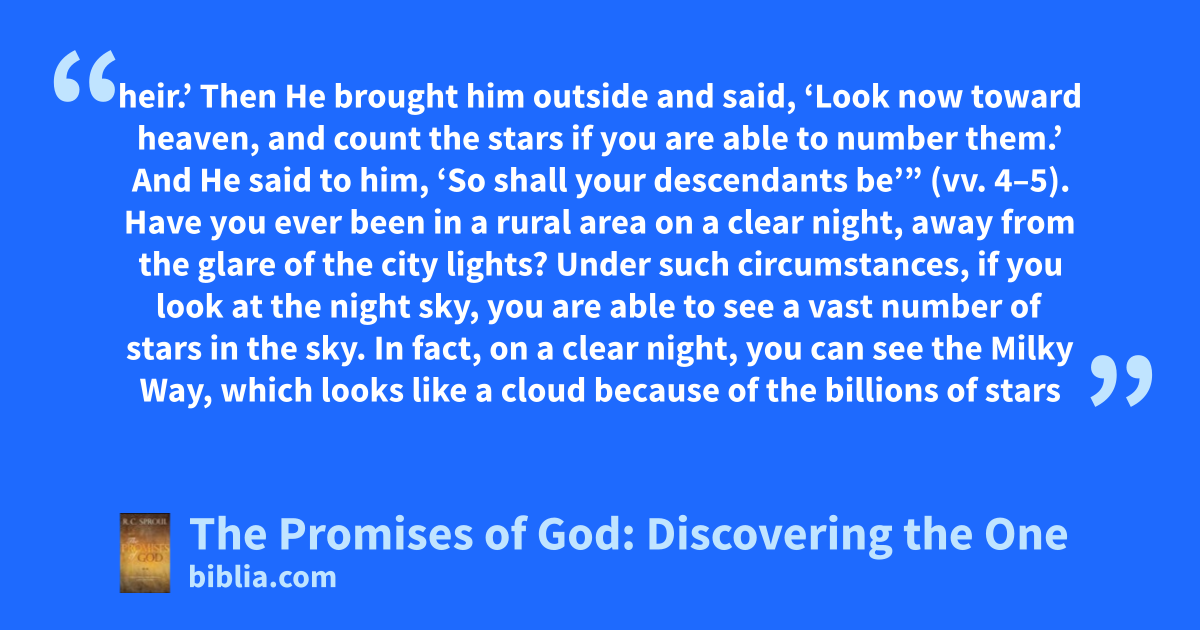 heir.’ Then He brought him outside and said, ‘Look now toward heaven, and count the stars if you are able to number them.’ And He said to him, ‘So shall your descendants be’” (vv. 4–5). Have you ever been in a rural area on a clear night, away from the glare of the city lights? Under such circumstances, if you look at the night sky, you are able to see a vast number of stars in the sky. In fact, on a clear night, you can see the Milky Way, which looks like a cloud because of the billions of stars