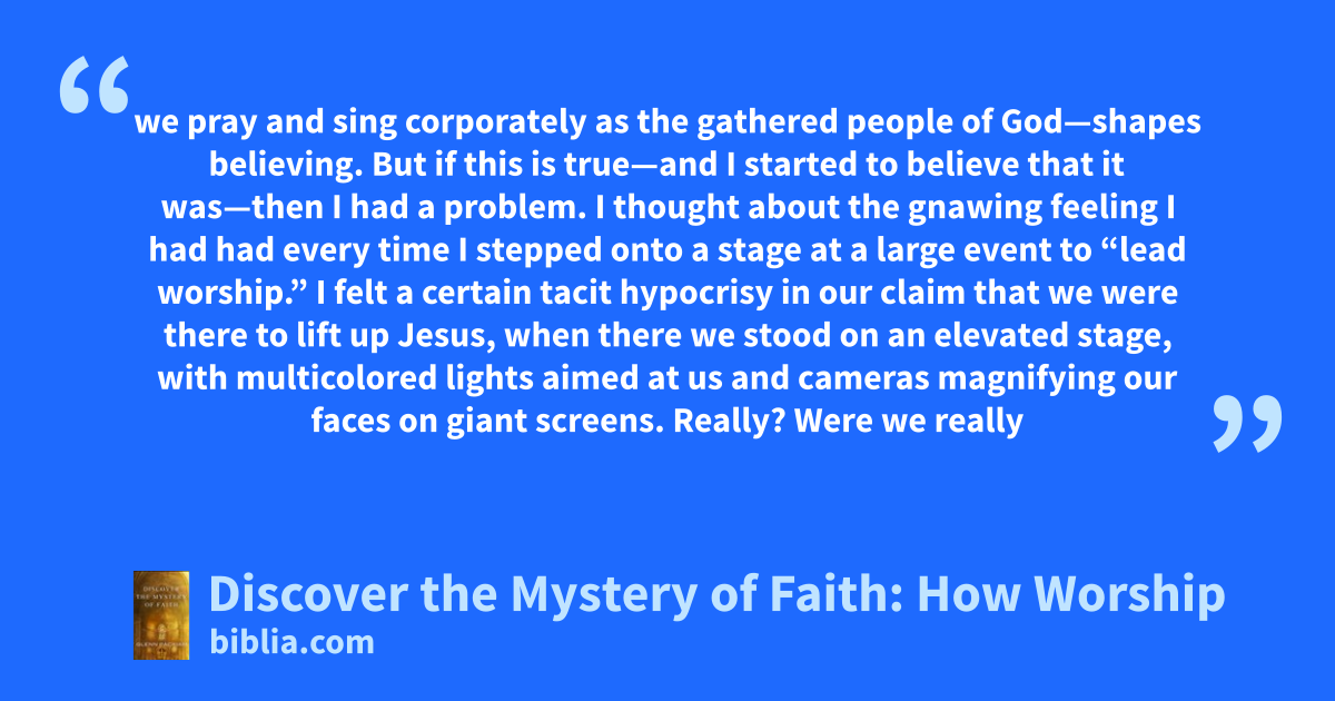 we pray and sing corporately as the gathered people of God—shapes believing. But if this is true—and I started to believe that it was—then I had a problem. I thought about the gnawing feeling I had had every time I stepped onto a stage at a large event to “lead worship.” I felt a certain tacit hypocrisy in our claim that we were there to lift up Jesus, when there we stood on an elevated stage, with multicolored lights aimed at us and cameras magnifying our faces on giant screens. Really? Were we really