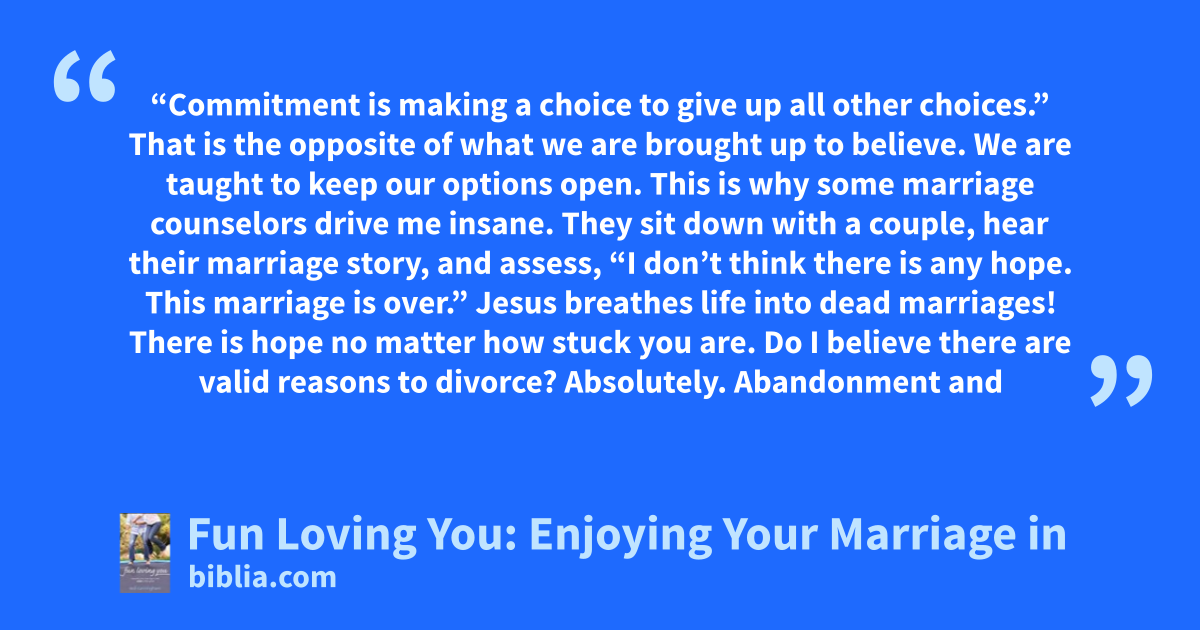 “Commitment is making a choice to give up all other choices.” That is the opposite of what we are brought up to believe. We are taught to keep our options open. This is why some marriage counselors drive me insane. They sit down with a couple, hear their marriage story, and assess, “I don’t think there is any hope. This marriage is over.” Jesus breathes life into dead marriages! There is hope no matter how stuck you are. Do I believe there are valid reasons to divorce? Absolutely. Abandonment and