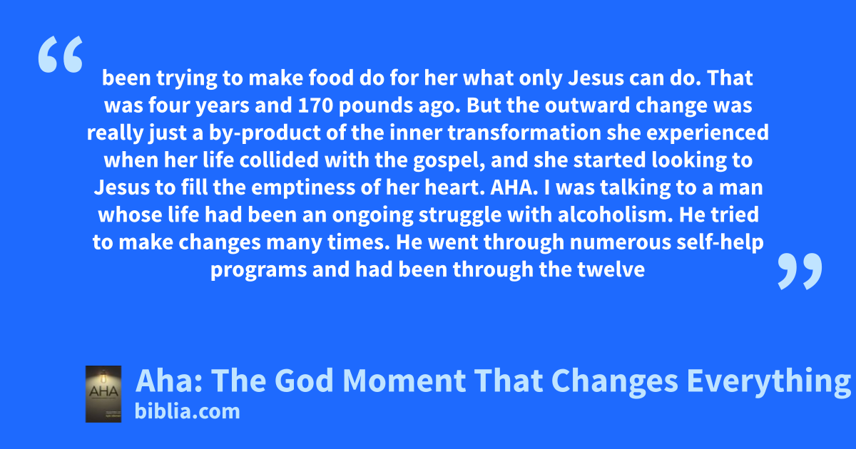 been trying to make food do for her what only Jesus can do. That was four years and 170 pounds ago. But the outward change was really just a by-product of the inner transformation she experienced when her life collided with the gospel, and she started looking to Jesus to fill the emptiness of her heart. AHA. I was talking to a man whose life had been an ongoing struggle with alcoholism. He tried to make changes many times. He went through numerous self-help programs and had been through the twelve