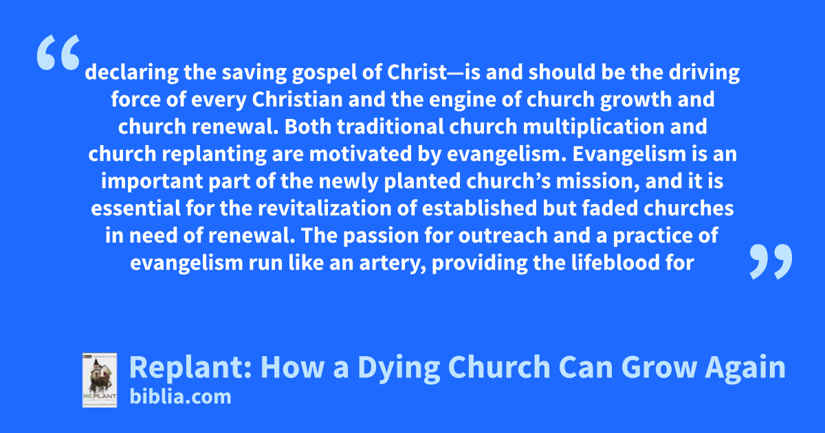 declaring the saving gospel of Christ—is and should be the driving force of every Christian and the engine of church growth and church renewal. Both traditional church multiplication and church replanting are motivated by evangelism. Evangelism is an important part of the newly planted church’s mission, and it is essential for the revitalization of established but faded churches in need of renewal. The passion for outreach and a practice of evangelism run like an artery, providing the lifeblood for