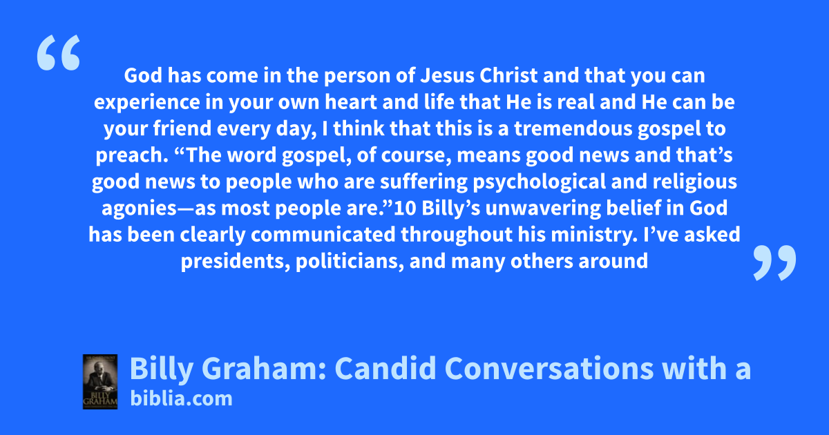 God has come in the person of Jesus Christ and that you can experience in your own heart and life that He is real and He can be your friend every day, I think that this is a tremendous gospel to preach. “The word gospel, of course, means good news and that’s good news to people who are suffering psychological and religious agonies—as most people are.”10 Billy’s unwavering belief in God has been clearly communicated throughout his ministry. I’ve asked presidents, politicians, and many others around