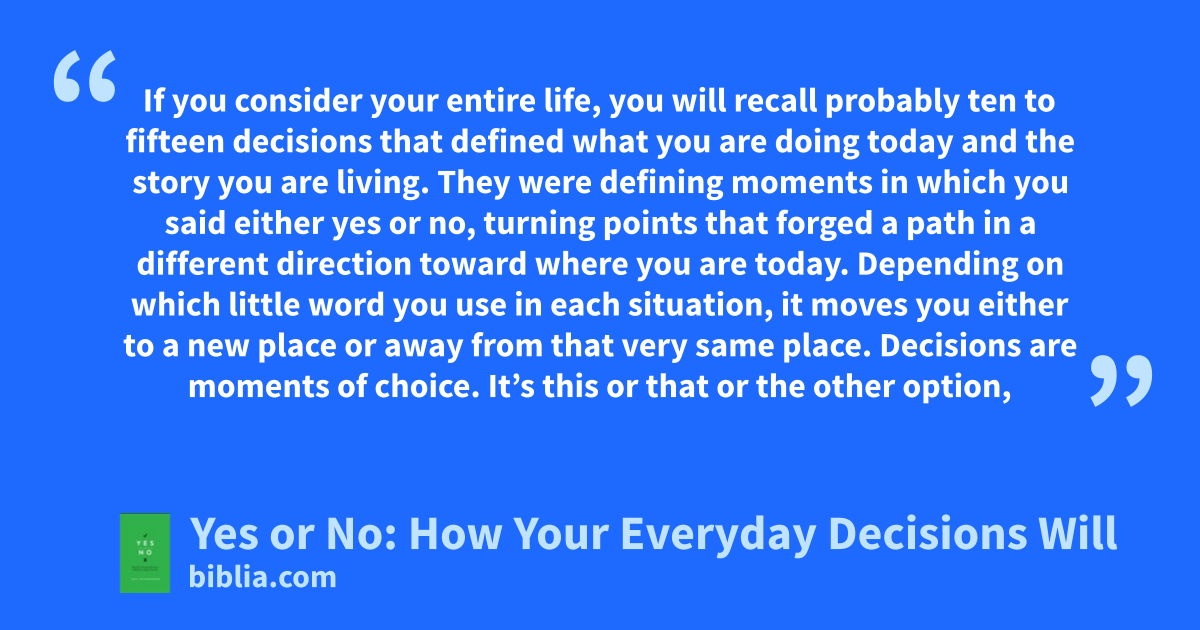 If you consider your entire life, you will recall probably ten to fifteen decisions that defined what you are doing today and the story you are living. They were defining moments in which you said either yes or no, turning points that forged a path in a different direction toward where you are today. Depending on which little word you use in each situation, it moves you either to a new place or away from that very same place. Decisions are moments of choice. It’s this or that or the other option,