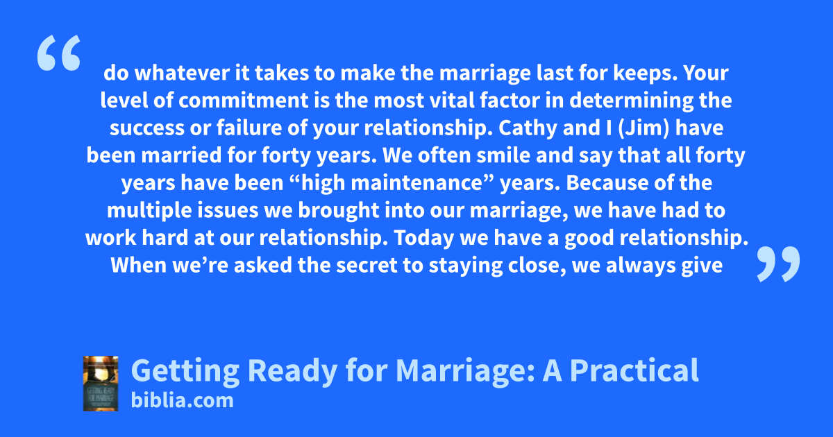 do whatever it takes to make the marriage last for keeps. Your level of commitment is the most vital factor in determining the success or failure of your relationship. Cathy and I (Jim) have been married for forty years. We often smile and say that all forty years have been “high maintenance” years. Because of the multiple issues we brought into our marriage, we have had to work hard at our relationship. Today we have a good relationship. When we’re asked the secret to staying close, we always give