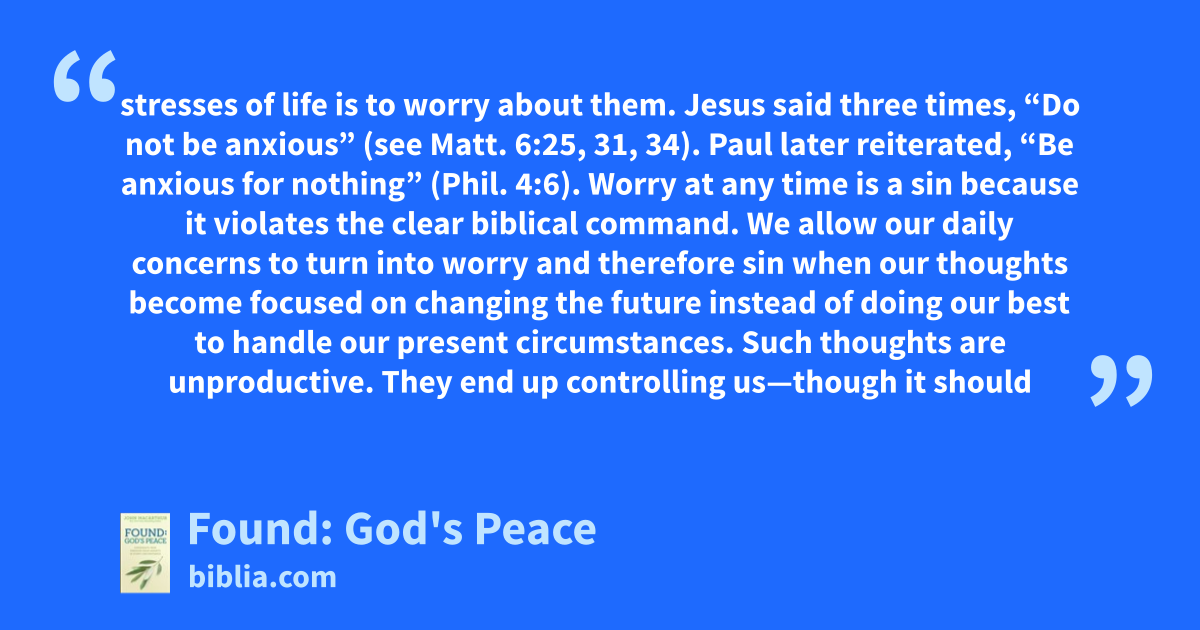 stresses of life is to worry about them. Jesus said three times, “Do not be anxious” (see Matt. 6:25, 31, 34). Paul later reiterated, “Be anxious for nothing” (Phil. 4:6). Worry at any time is a sin because it violates the clear biblical command. We allow our daily concerns to turn into worry and therefore sin when our thoughts become focused on changing the future instead of doing our best to handle our present circumstances. Such thoughts are unproductive. They end up controlling us—though it should